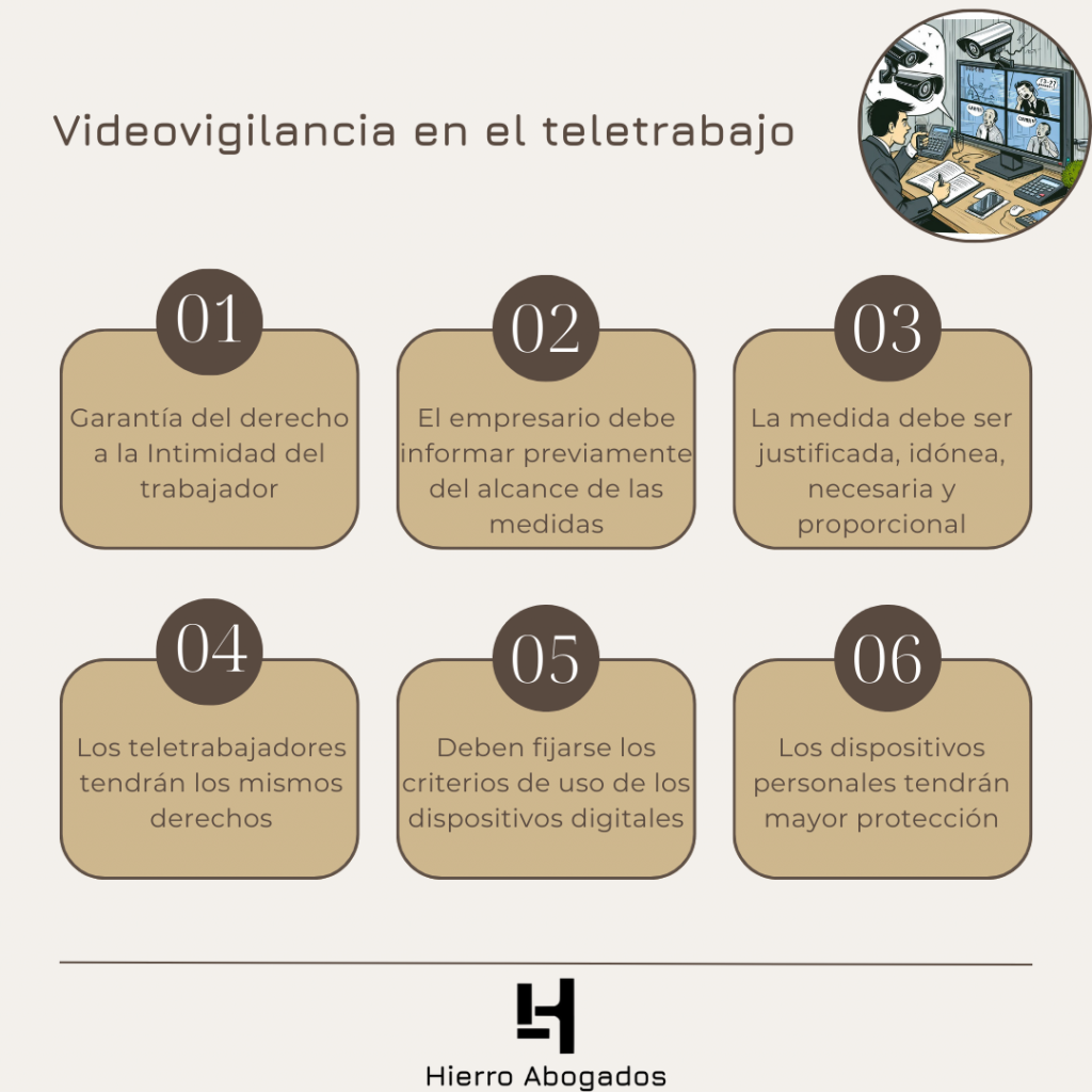 Siempre que se respeten las garantías expuestas, los empresarios cuentan con derecho a implementar medidas de control frente los dispositivos electrónicos del trabajador que realiza su jornada de trabajo a distancia. Así, una de las medidas aplicadas con mayor frecuencia en la actualidad es la imposición de programas de videovigilancia. La sentencia del Juzgado de lo Social de 20 de septiembre de 2021 rec. 330/2020 se pronuncia al respecto, aclarando que la Ley Orgánica 3/2018, de 5 de diciembre de Protección de Datos Personales y Garantía de los Derechos Digitales establece en su art. 87, relativo al derecho a la intimidad y uso de dispositivos digitales en el ámbito laboral, que todos los trabajadores tendrán derecho a la protección de su intimidad en el uso de los dispositivos digitales puestos a su disposición por su empleador, pudiendo este acceder a sus contenidos a los solos efectos de controlar el cumplimiento de las obligaciones laborales o estatutarias, garantizando la integridad de dichos dispositivos.
